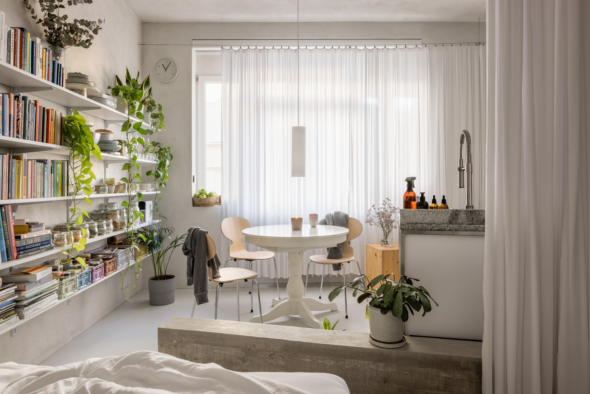 私たちは光が重要だと言いました。美しく大きな窓が 2 つある小さなアパートの新しいデイスペースです。元のレイアウトでは、各窓が 1 つの部屋に属しており、暗い廊下が形成されていました。家の正面と背面の透明なガラスレンガの壁だけで定義される 1 つの大きな明るい空間。その後ろには、シャワー付きのバスルーム、洗濯機、シンク、戸棚、収納など、アパートで快適に機能するために必要なものがすべて揃っています。スペース。