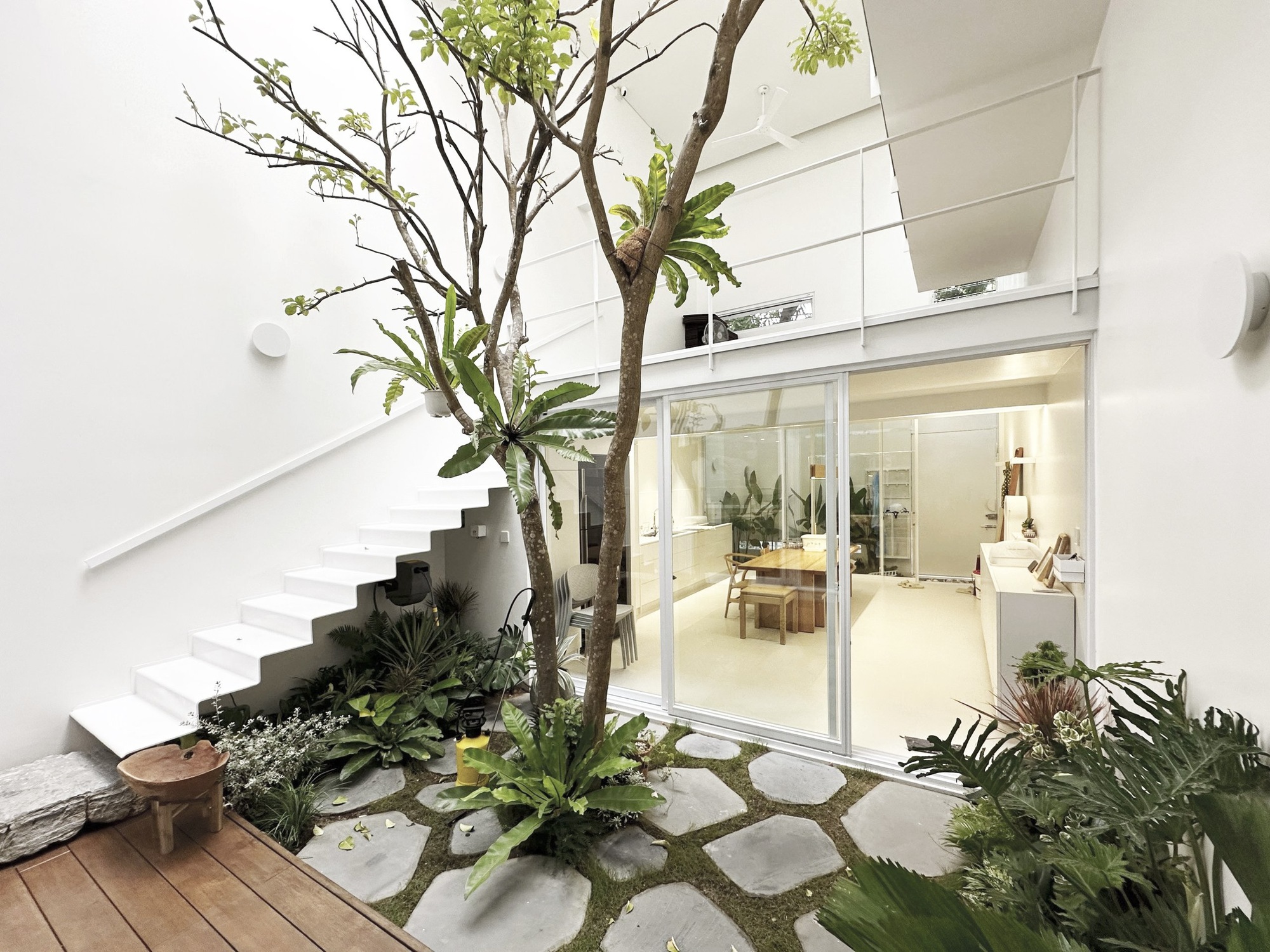 グリーン コネクション (オム ケイ) – スペース – グリーン – スペース: 家の中に住む階層的な接続スペースを開発するための屋内緑地のための創造的な空間条件。すべてのアクティビティは緑の木々の周りで行われ、家の空間を暖かく快適にします。つながりのあるデザインのテクスチャーとリズムが、睡眠空間とゲストに柔軟性と照明を生み出します。特に家の前にはマンゴーの木があるので緑が多く、家の内から外に至るまで白を基調とした空間が増え、空間と木々の緑とのつながりを際立たせるシンプルなモノリシックデザインとなっている。家。