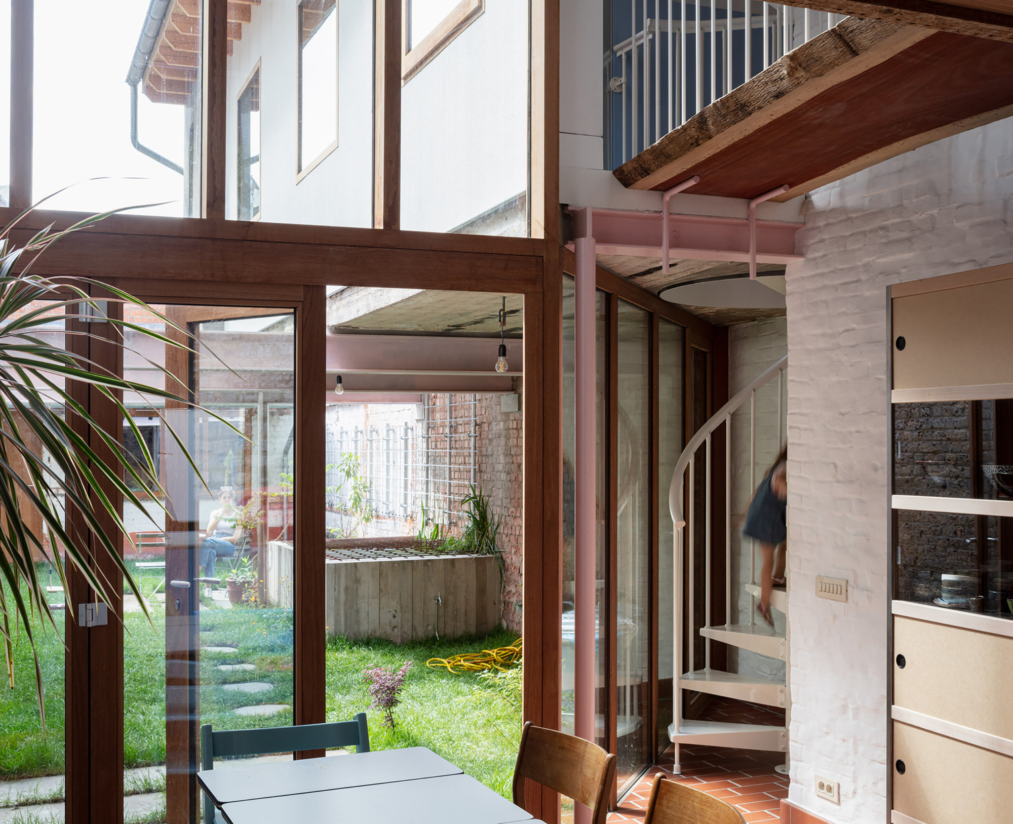 居住空間は、内と外、奥行きと高さの変化を中心に構成されています。既存の階段、螺旋階段、吹き抜け、橋によって、1階のキッチンと2階のリビングスペースおよびキャラバンの間にループが形成されます。キャラバンには、保管室、追加のバスルーム、トイレのスペースがあります。 2階にはオフィスが整理されます。オフィスからは屋上庭園と出窓にアクセスできます。 3階と4階の客室はバスルーム付きの寝室として配置されます。
