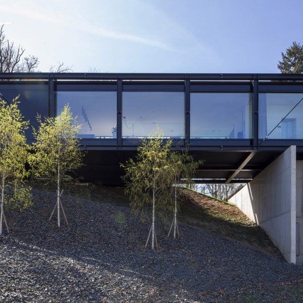 鉄骨の箱が橋のように大きなコンクリートの支柱の上に置かれ、地元のスタジオ Stempel & Tesar によるチェコ共和国の邸宅、Villa Sidonius が形成されました。
