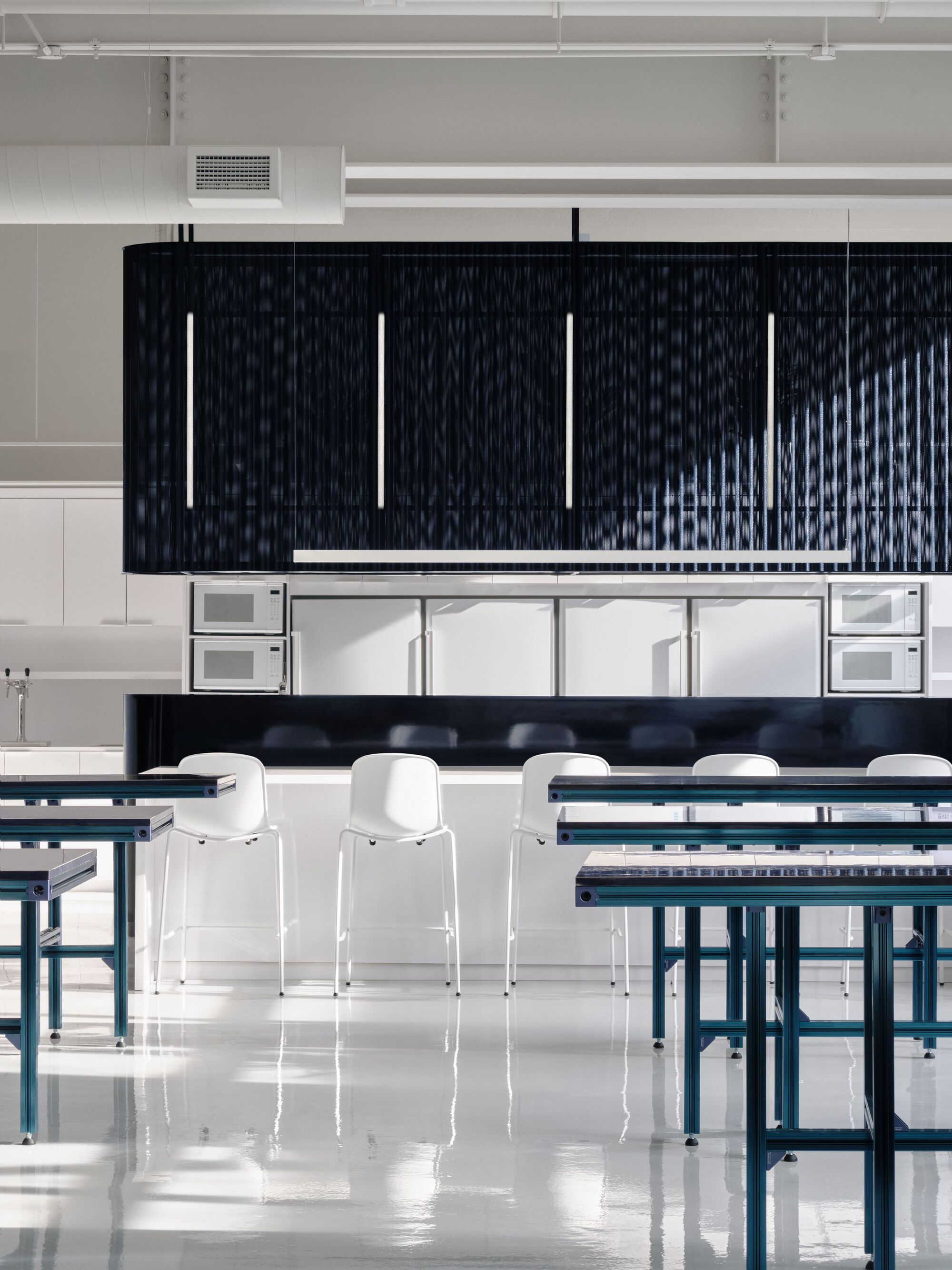 スペース内のすべてのテーブルは、Vention チームと協力して、青いアルミニウムの押し出し材を使用してカスタム設計されました。天板はネイビーブルーのスモークガラスパネルで構成されており、天板を保持するユニークな構造が特徴です。 Vention の特殊な押し出し組立技術は、家具を真に表現する家具を作成するのに役立ちました。このプロジェクト全体は、Vention の代表的な製品と優れた企業文化に大きくインスピレーションを受けました。