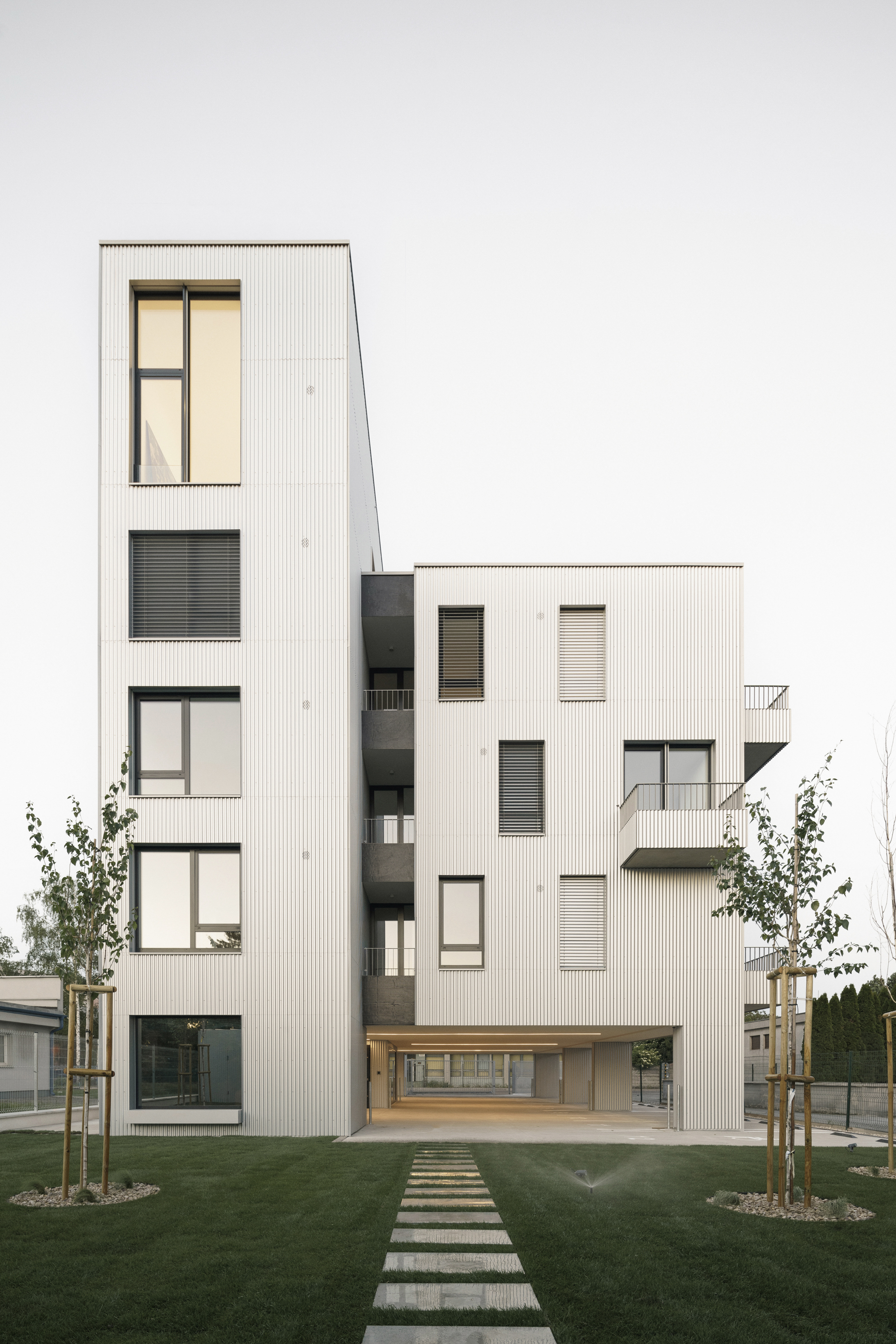 都市的には、この建物は、曲がりくねった部分にある未完成のポドゥナイスカ通りを明確に表現して補完し、新たに出現する通りのラインに接続しています。その視覚的アイデンティティは、通りに沿った建物のスケールを細分化した 2 つの異なるボリューム (「煙突」と「箱」) によって定義されます。