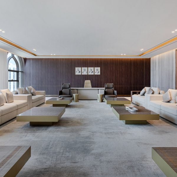 シェイク・フメイド・ビン・ラシード・アル・ヌアイミのオフィスでは、ロアはニュートラルな色調を使用し、このスペースのために特別に作成されたウルトラ・アルテによるアートワークを追加しました。