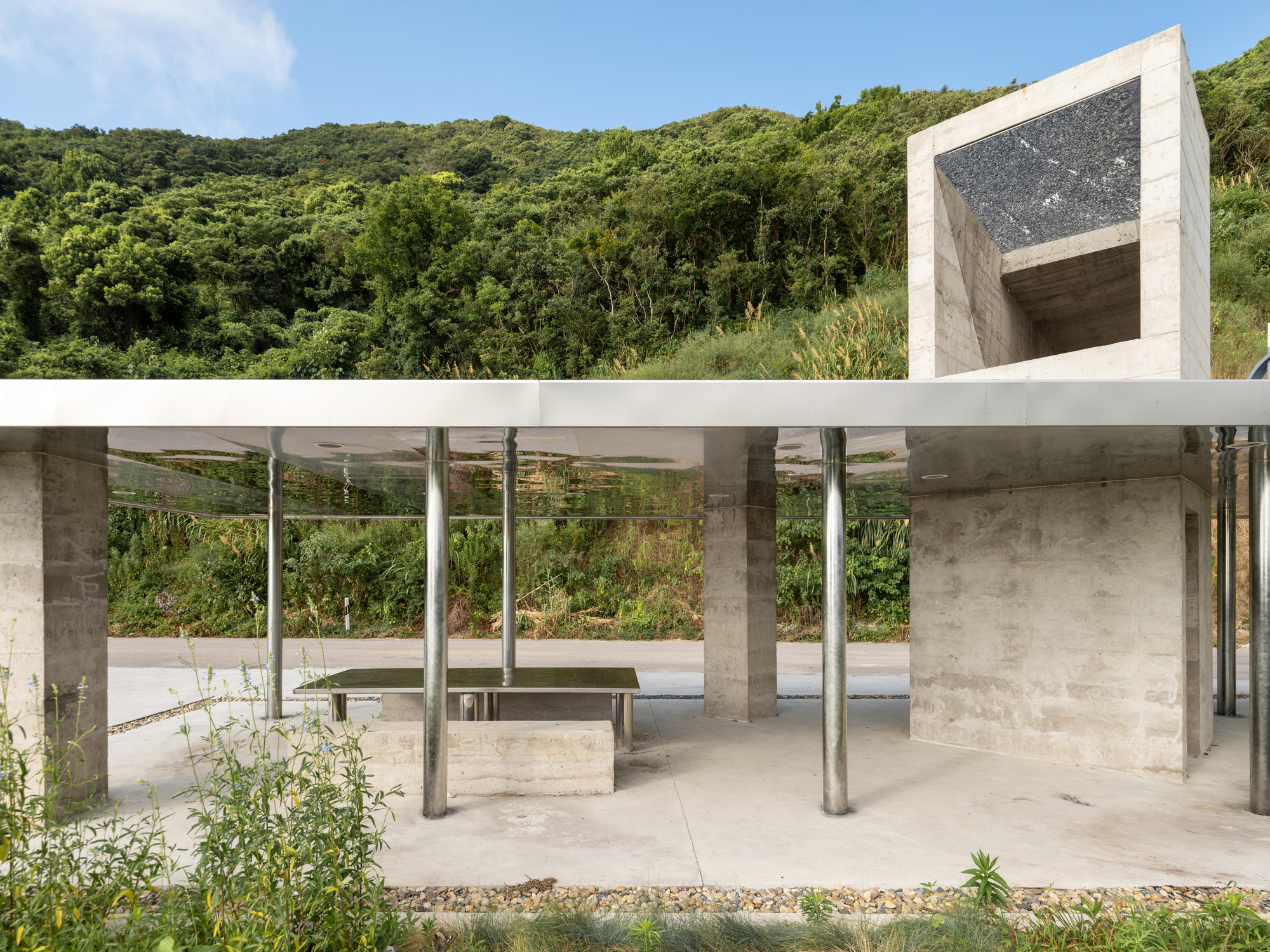 これらの実質的なフォームは、屋外の家具として機能し、訪問者にテーブルとベンチを提供します。ペリスコープタワーは薄い屋根を突き刺し、人々が上向きに見て、遠くの風景の反射を見ることができます。