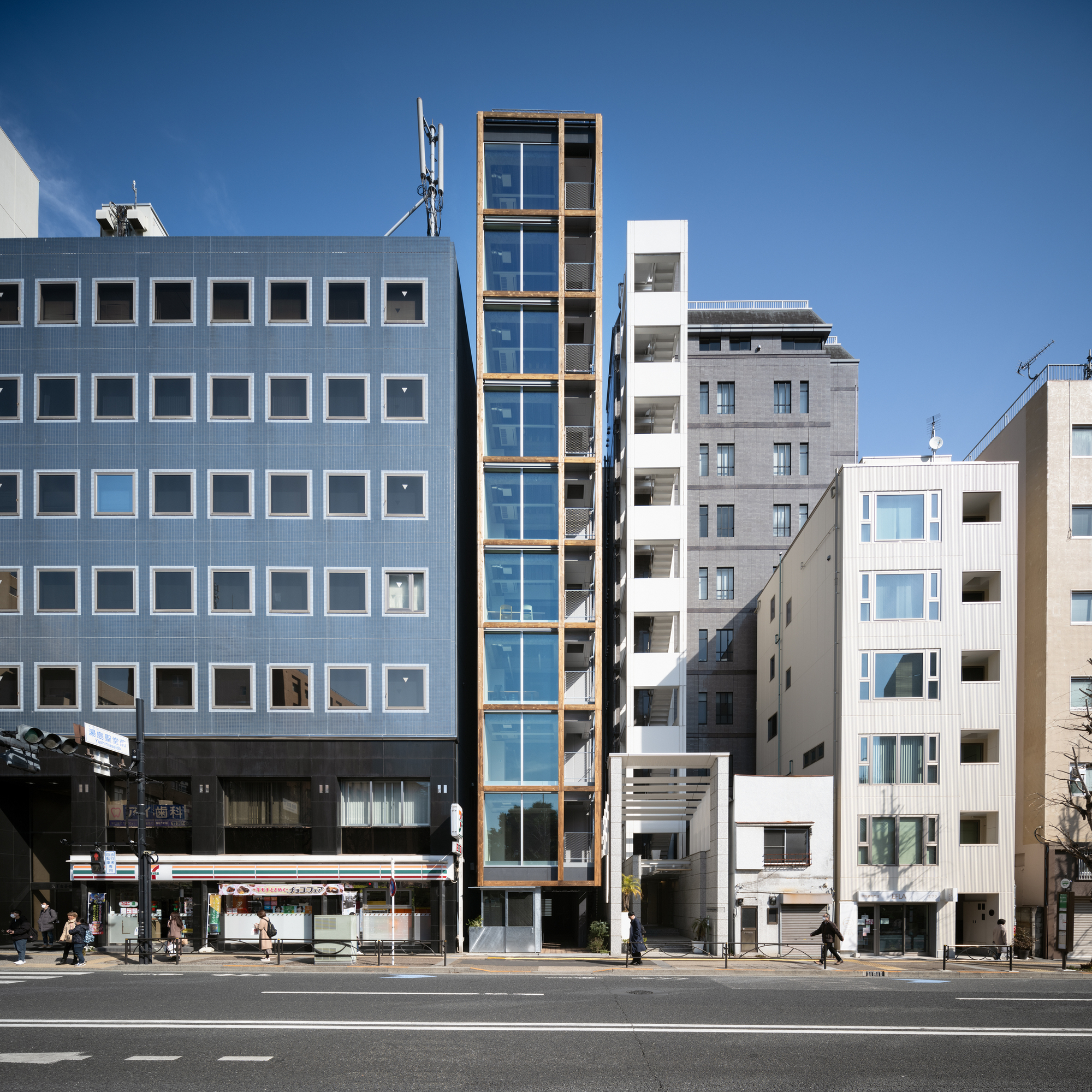 東京中央部のカンダ筋ジン神社の近くにある都市を包含する木製の輪郭は、象徴的なYoushima Seidoを直接見る歴史的なナカセンドのルートに面した狭い5.2mx 14.5mのロットにあります。同様に背の高い建物に囲まれたこの密集した都市環境では、このデザインは、支配を主張するのではなく、都市の景観内での建物の輪郭を柔らかくぼやけする方法に焦点を当てています。