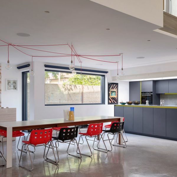 リビングエリアには、壁一面に張り巡らされた「連続した」図書室と、1階の寝室につながる実用的な赤い階段も特徴です。これらは、線路からの騒音を軽減するために、重厚なブロックワークと斜めの窓を備えた設計になっています。
