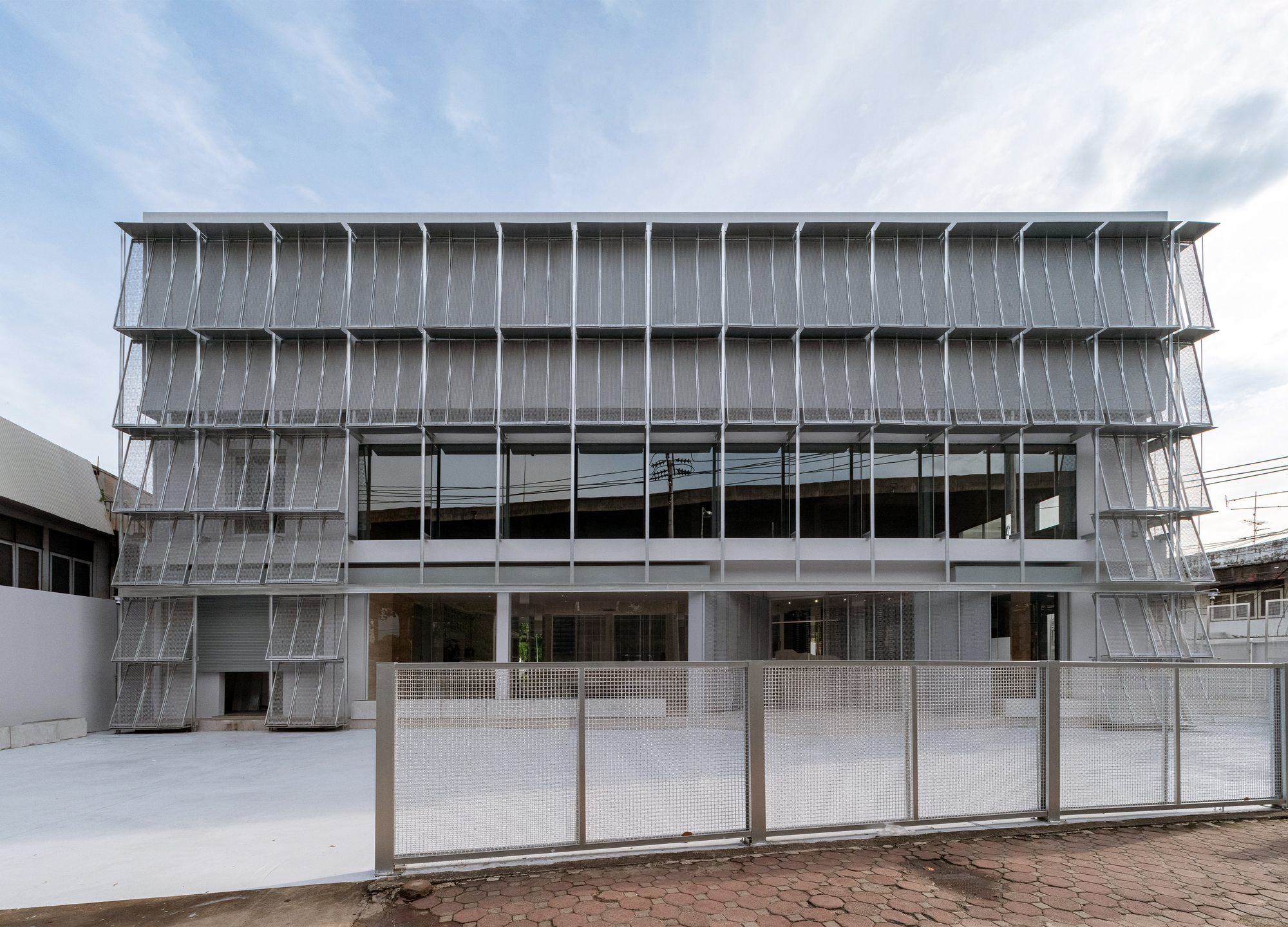 交通量の多いバンナートラッド通りに面した建物のファサードのデザインは、改修前にプロジェクトオーナーが観察したように、建物の以前の使用方法からアイデアと材料を借用しました。自動車の部品を保管していた元ガレージスペースを、金網製の吊り下げ器具を使って、このパネルを2段に積み重ねることで興味深い管理を進めました。これにより、斜めおよび垂直の配置を組み込んだパターンが作成され、建物の正面に透明性を提供するとともに、換気のための開口部を備え、高い正面フェンスを必要とせずに建物の安全性を強化しました。さらに、ワイヤーメッシュパネルを斜めに配置することで軒を張り出すことができ、建物の日除けと同様の日陰を提供します。
