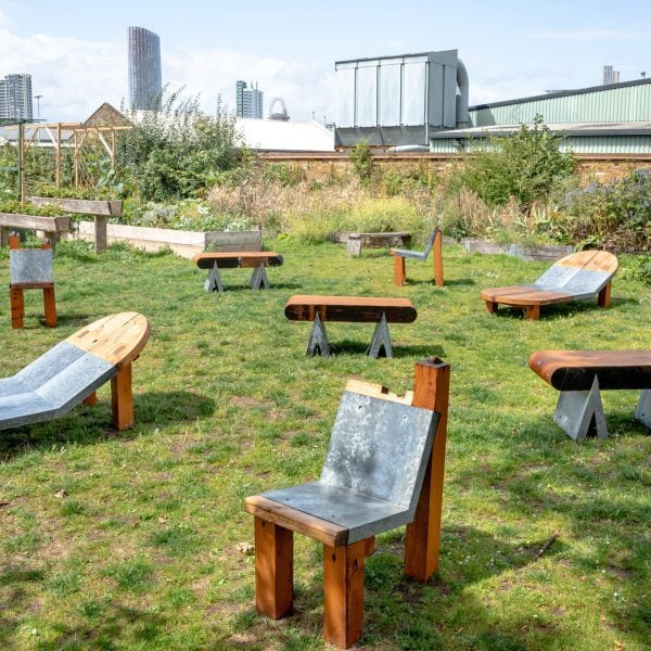 建築家のエイドリアン・ラウは、古いプランターの鋼材部品と取り壊された陸軍兵舎の梁を組み合わせて、ロンドン東部の食料生産コミュニティ向けの椅子とベンチを作りました。