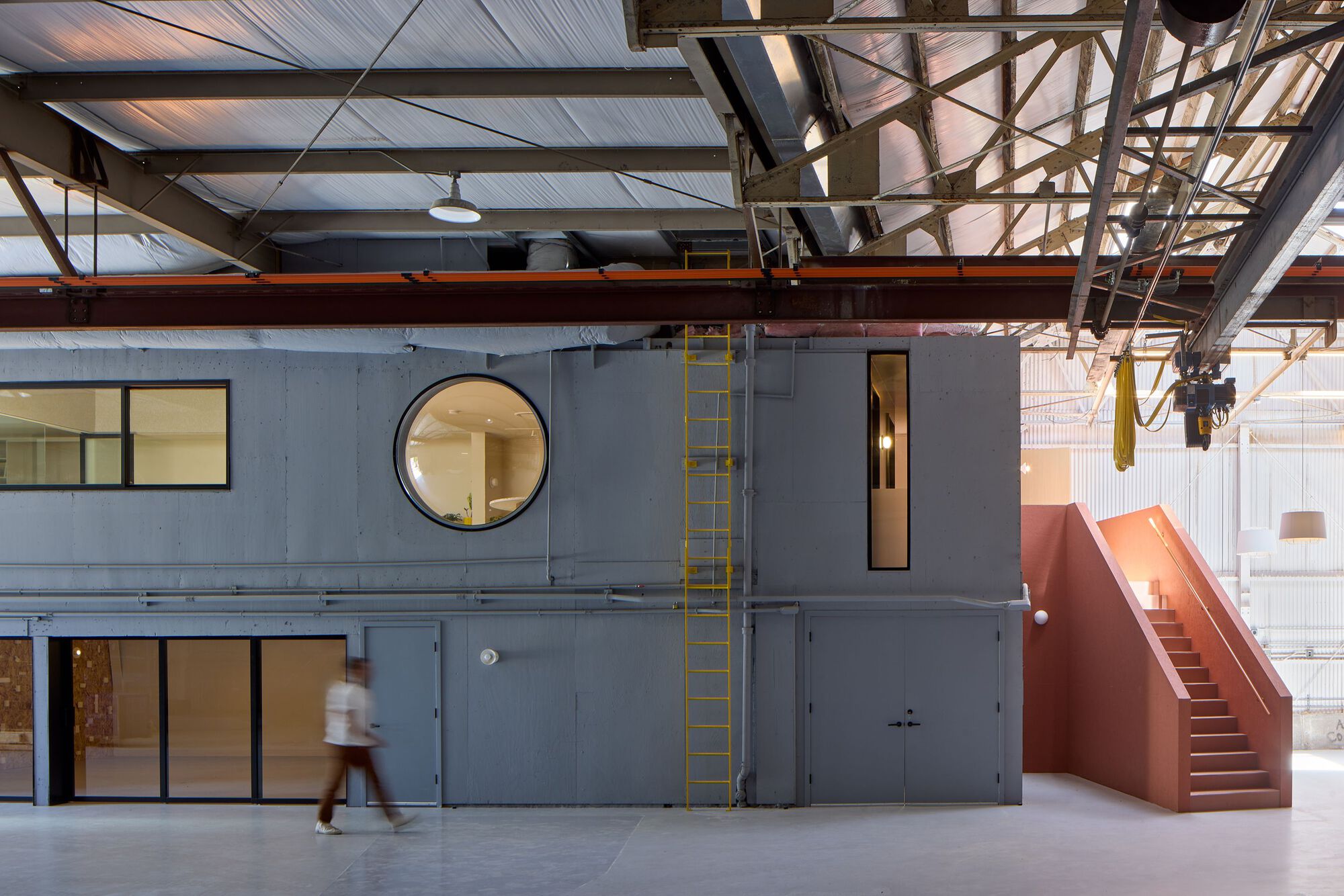 このプロジェクトは、空間間の境界線とコントラストを強調し、多機能の要件にも対応しながら歓喜の瞬間を作り出します。機能の違いや部屋間の遷移を強調することで、クライアントのさまざまなニーズに対応します。 2 階のオフィスは典型的な倉庫の中二階として機能し、空間を見渡せる見晴らしの良い場所を提供します。新しい彫刻的なサンゴ塗装合板の階段が倉庫とオフィスを繋ぎ、循環への記念碑的でモノリシックなアプローチを形成しています。各部屋はさまざまなアクティビティに柔軟に対応できます。 「仕事」機能には、デスク、個人用オフィス、スタジオの下層階のメーカースペースが含まれます。 「パーティー」機能では、ローラーダービー、こぢんまりとした映画館、にぎやかな市場から広い倉庫スペースでのピアノコンサートまで、幅広いイベントを含むプログラムで、昼間の空間を夜のアクティビティに変身させます。