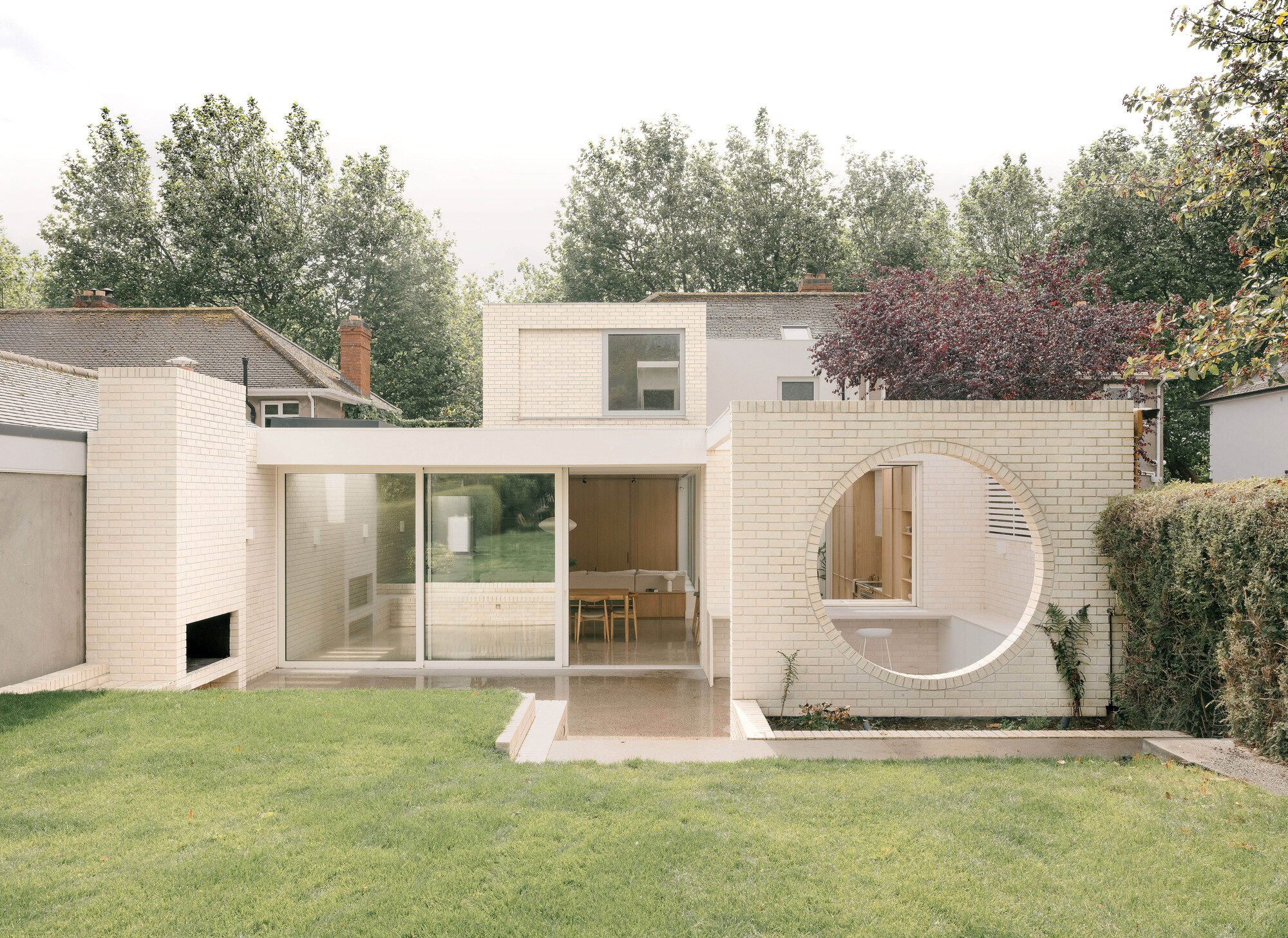新しい廊下の延長の終わりには、印象的な白いクリスタルガラスのドアが、背面に面したモダンな2階建てのレンガ造りの延長に開かれます。 1階には、オープンプランのリビング、キッチン、ダイニングエリアが含まれ、1階はマスタースイート専用です。 1階の中庭は、自然光をスキームの中心に引き込みます。
