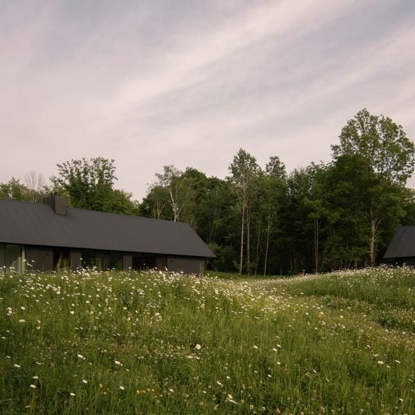 ブルックリンを拠点とするスタジオ、Group Projects Architecture は、ニューヨーク州北東部の牧草地に波形金属で覆われた長い切妻屋根の家を建てました。