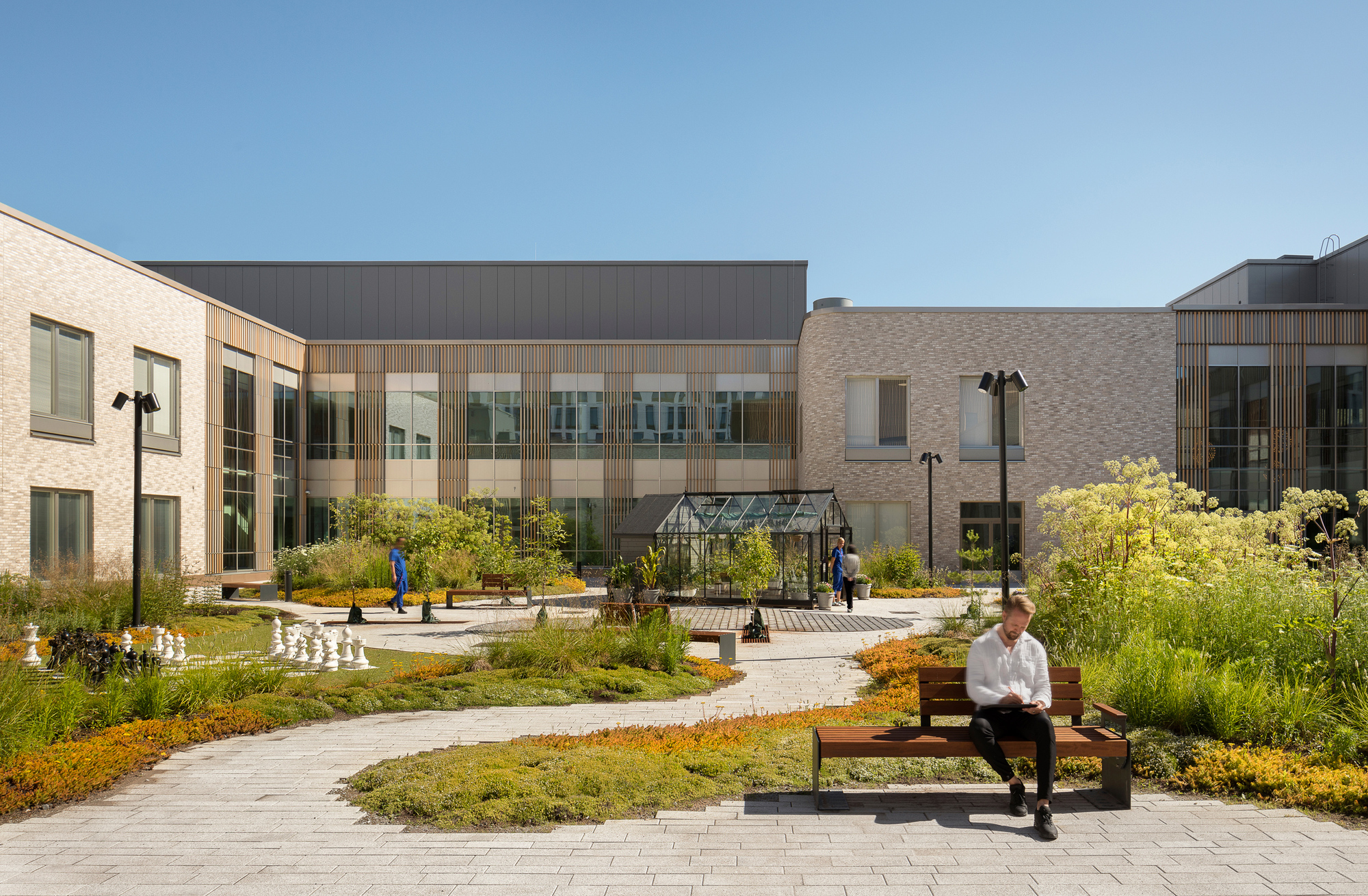 タンペレの産業遺産と歴史あるピトカニエミ診療所の自然環境からインスピレーションを得たデザインには、レンガと木材が組み込まれており、モダンで温かみのある地元に根ざした雰囲気を作り出しています。建物の抑制された高さは人間のスケールを維持し、環境とのつながりを促進します。自然光を重視したデザインにより、人工照明の必要性が減り、室内環境が向上します。古い病院の家具を使用することで文化の継続性が高まり、プロジェクトによる環境への影響が最小限に抑えられます。さらに、空間配置により業務効率が向上し、ペアになった各部門でコアが共有されるため、柔軟性が向上し、リソースの必要性が軽減されます。これにより、プロジェクトは直接のユーザーだけでなく、より広範なコミュニティや環境に利益をもたらすことができます。このデザインでは景観が重要な役割を果たします。松林に囲まれたこの施設は、建築に緑を取り入れ、穏やかで癒しの雰囲気を強化しています。各建物は、各病棟のバルコニーや人里離れた中庭などの屋外スペースに直接アクセスでき、自然との交流が治癒プロセスに不可欠であるという考えを裏付けています。複合施設の中心にある囲まれた中庭は、コミュニティの拠点として機能し、社会活動を促進し、運動やリラクゼーションのための安全な囲まれた空間を提供します。科学的根拠に基づいた設計原則に沿って、自然と屋外スペースに重点を置くことで、精神的および肉体的な健康をサポートします。