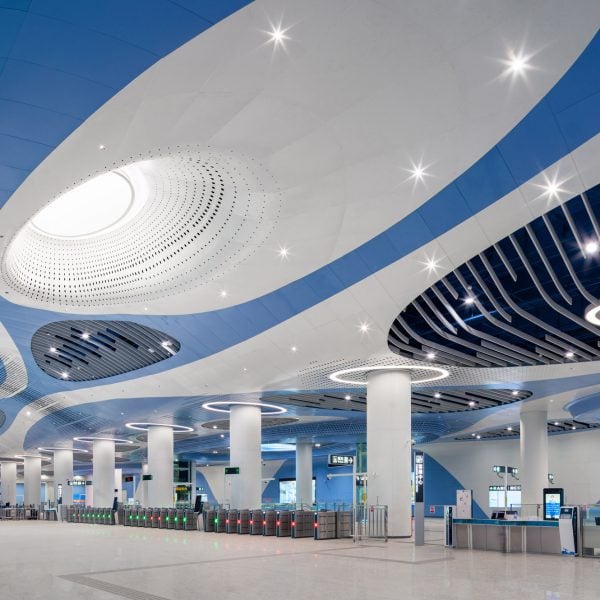 チェットウッズ作の大梅沙駅の曲面アルミニウム天井は湾曲したアルミニウムプロファイルから作られています