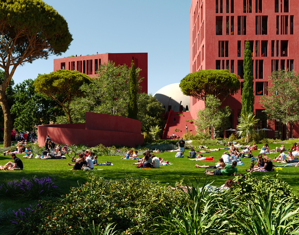 オッペンハイム・アーキテクチャーによって設計されたティラナのヨーロッパ大学の新しいキャンパスは、アルバニアの文化的および歴史的背景とつながりながら、学術的、社会的、外交的関与を促進する空間を創造する実験を表しています。その中心となるのは中央の円形の「アゴラ」で、ギリシャ・ローマの劇場からインスピレーションを得た多目的スペースで、その上にはアルバニアの象徴的なバンカーを参考にしたコンクリートのドームが取り付けられています。アゴラは、公開性と民主主義の理想を反映し、講演、パフォーマンス、対話のための象徴的かつ物理的な拠点として機能します。アゴラの周囲には、公共プログラム、教育、外交に特化した建物があり、図書館、博物館、ロッジアなどの開放性を促進する機能を通じて、機能性と公共のアクセシビリティのバランスをとるように設計されています。