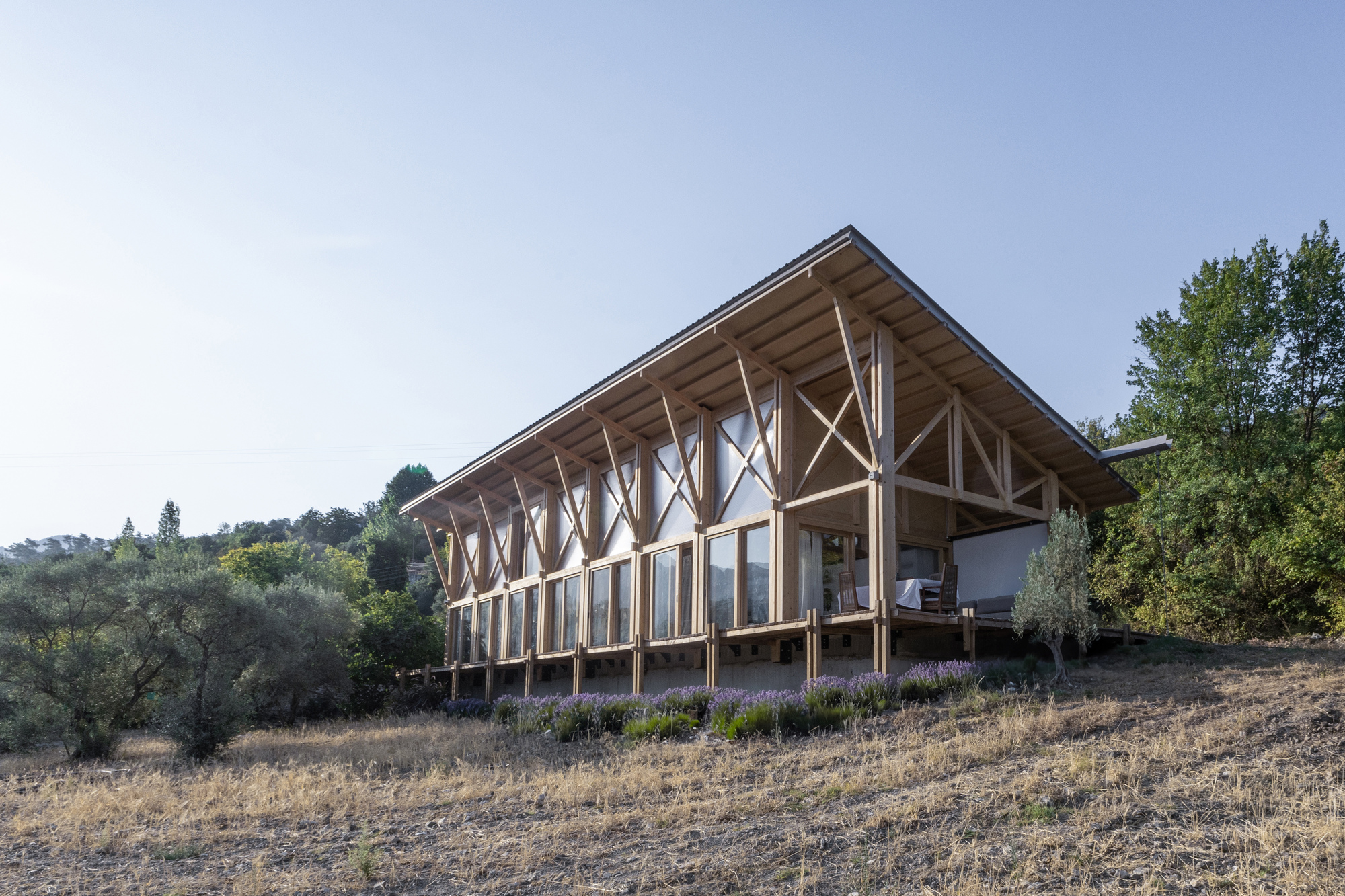 この家は地中海の建築の伝統を現代的に解釈したもので、木造建築と再生石壁を巧みに組み合わせて、見た目にも印象的で環境にも配慮した住宅を作り出しています。対照的なファサードは、地元の気候に意図的に対応し、快適さ、エネルギー効率、そして周囲の景観との強いつながりを提供します。