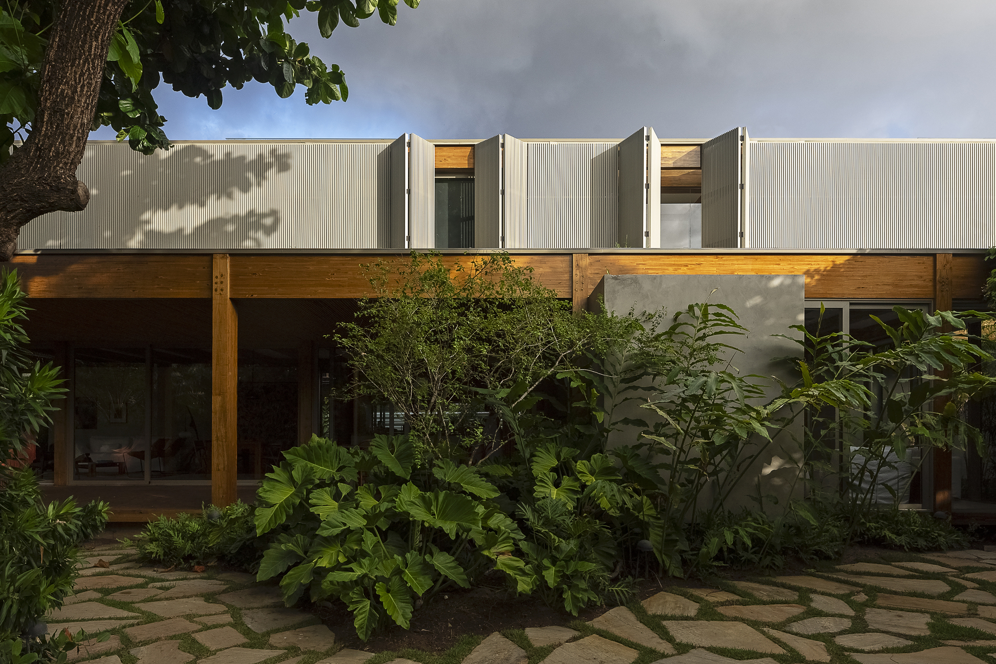 木製の構造物の明確に定義されたリズムとは対照的に、上階は完全にアルミニウムの兄弟で覆われており、ベッドルーム、クローゼット、バスルームの折りたたみ式ドアのように開きますが、閉じたときはユニークなボリュームを作成します。