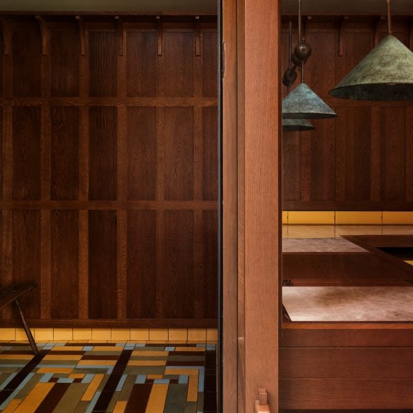 店舗の内装に使用されているステインオーク材の外装材は、日本の建具やエドワード朝時代の羽目板からインスピレーションを得たものです。素材の選択は、空間に温かみと歴史的なディテールをもたらすことを目的としています。