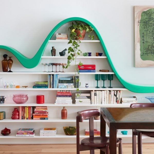 「有機的な緑色のリボンの形をしたこのユニークな作品は、壁一面に固定されており、サイドボードとしても機能します」とバトリボイ氏は語った。