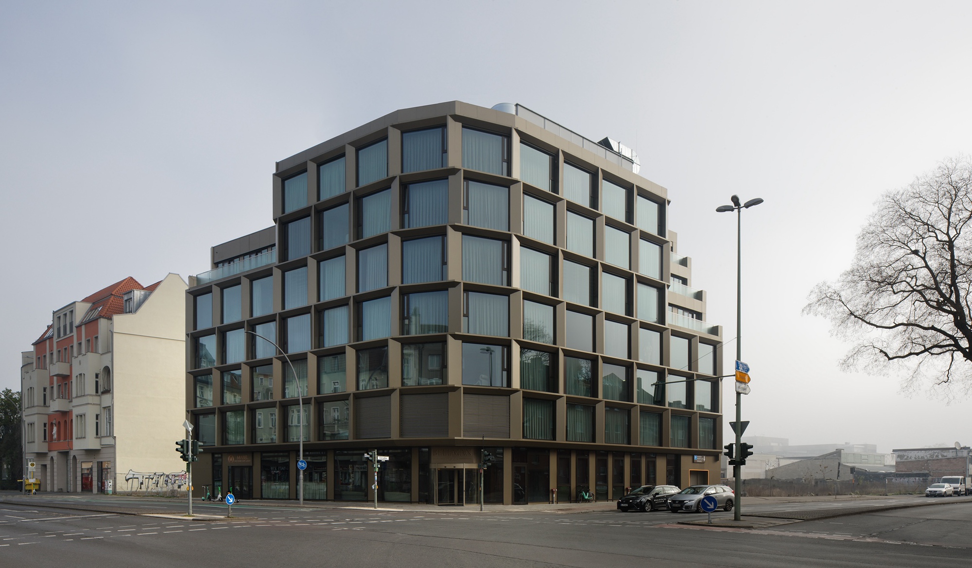 建築家が提供するテキストの説明。カール・マルクス・ストレスとグレンザルリーの角にあるホテルのベルマン・ベルリン・ネオコエルンは、ニューヨークの肉パッキング地区の生のエネルギーに触発された活気のある地域で建築的声明を出す、印象的で黄金色の青銅色のアルミニウムとガラスのファサードを備えた新しい建物です。 7階建ての境界ブロック開発は、街路側の閉鎖建設のおかげで、近所に均一に溶け込み、捨てられた街角に構造的な結論を与えます。建物の高さ、建物のライン、建物の深さは、部分的にウィルヘルミニア風の隣接する建物の間を仲介します。それぞれの建物のコーナーのずらした背中は、このエリアに典型的な軒の高さに適応し、均質なファサードグリッドを分割し、さまざまなデザイン要素になります。