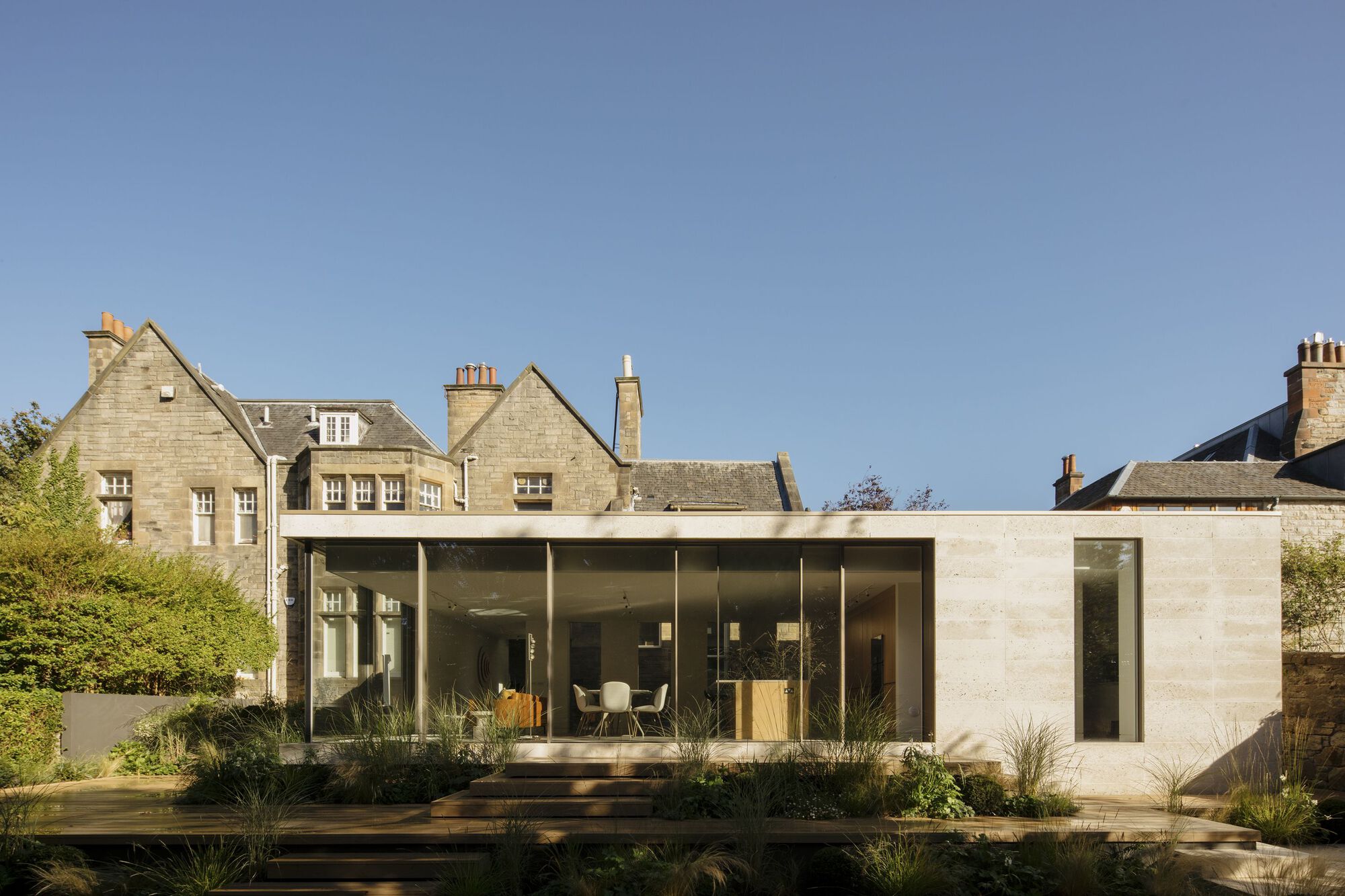 Archer + Braun のデザインには、天然素材とミッドセンチュリーの美学が組み込まれており、周囲の風景を引き立てています。エディンバラの多くの増築で使用されている一般的なバフ砂岩とは異なり、建築家らは風化した質感のある外観に寄与する化石の跡が特徴のポートランド石を選択しました。増築部分の温かみのあるシルバートーンの外装と繊細な金属屋根は、ミニマリストでありながら自然なインテリアの美学と調和し、元の構造の特徴を損なうことなく、古い空間と新しい空間に連続性を生み出しました。