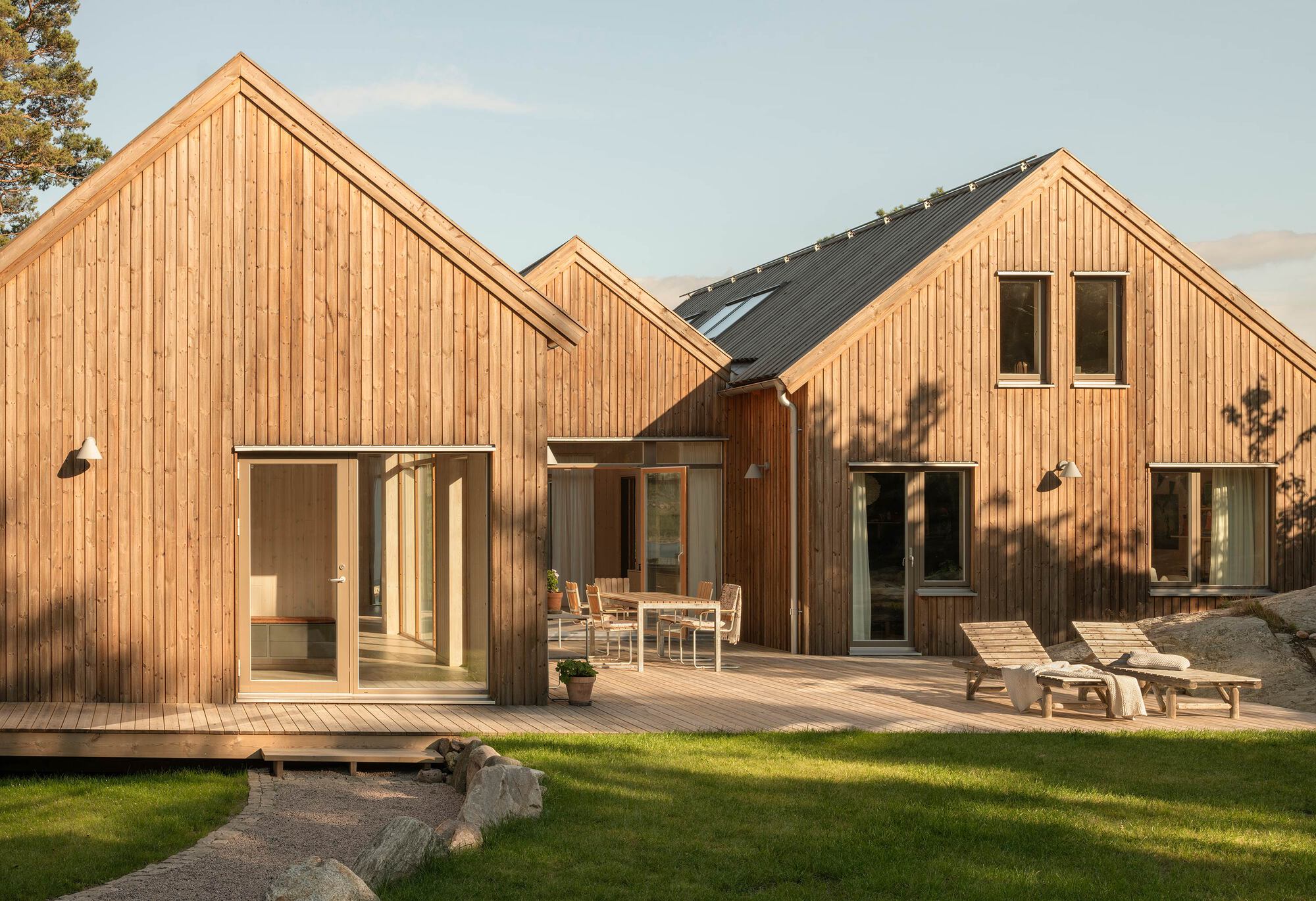 建築家が提供するテキストの説明。スウェーデンの頑丈な西海岸では、オレスト島には自然な静けさがあり、天気は土地自体と同じくらいのキャラクターです。島の東端にあるヴィラ・ウルヴァスは、穏やかに傾斜した陰謀に繊細に配置されています。常に存在する海は、シーンを支配しています。それは、風景の静かな美しさが強力な風によって頻繁に中断される場所であり、長年にわたって建築に刻印を残してきました。穏やかさとカオスの間のこのダイナミクスは、家のデザインを知らせます。