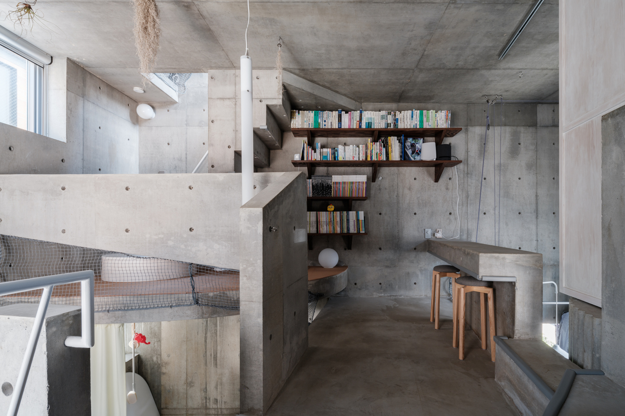 まず、サイトの全範囲で囲まれたスペースを作成することから始めました。 26平方メートル未満のスペースには、トイレ、バス、キッチンなど、必要な生活のオブジェクトを配置しました。 2つの階段、猫の通路、手すり、ベンチのように生きるための「外殻」を構成するコンポーネントを追加すると、スペースはすぐに満たされました。家の中から、すべてのオブジェクトを一度に視野に入れることは不可能です。これらは家自体に関連して膨大です。それらのスケールは、空間のスケールよりも同じ、または時にはさらに大きいです。コンクリートの壁の粗い表面には、光と湿った涼しさのぼやけだけが見えます。壁がどこまで続くか、どこで終わるのかは不明であり、大きくて重いように見えます。家は住民のものに属しているべきですが、誰にも属している所有権を回避するように見えます。