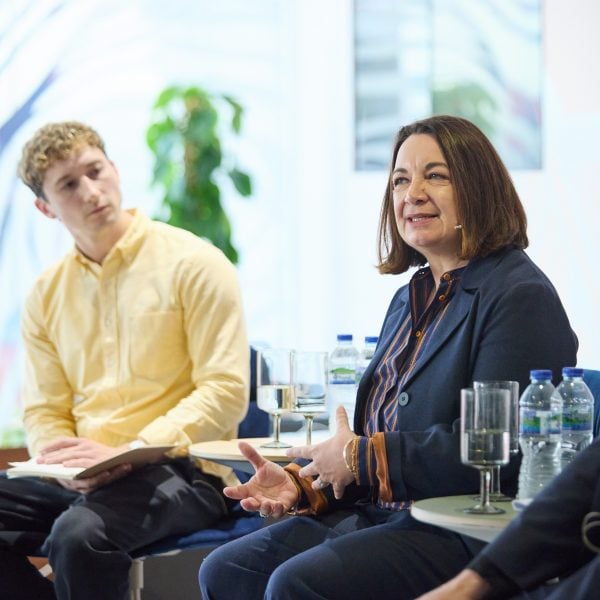 「Joy at Work」と題されたパネルディスカッションは、Steelcaseのロンドンショールームで開催され、ワークプレイスデザインおよびコンサルティングを担当する同社のEMEAディレクターであるエレナ・デ・カン氏、建築家でFoster + Partnersのパートナーであるシモナ・ベンチーニ氏、オフィスデザインの専門家でWorkTech Academy会長のジェレミー・マイヤーソン氏が登壇した。 Dezeen の特集編集者である Nat Barker がモデレーターを務めています。