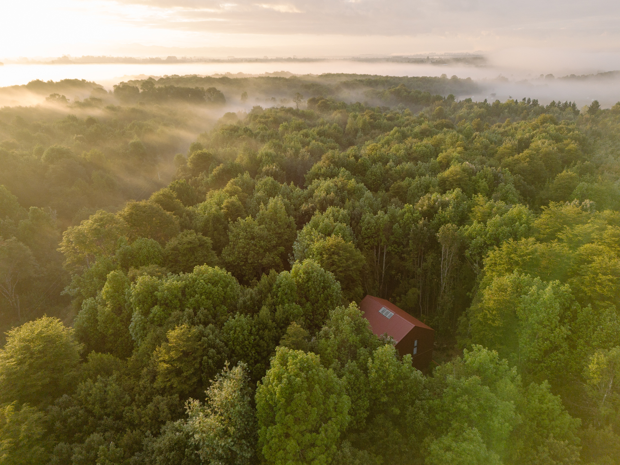 家の共用エリアは 1 階にあります。開口部は最小限に抑えられ、避難所の感覚を強化し、森林特有の濾過された光を維持します。 2 階にはベッドルーム 2 室とバスルームがあり、プロジェクトの中心となる中央の空洞で区切られています。