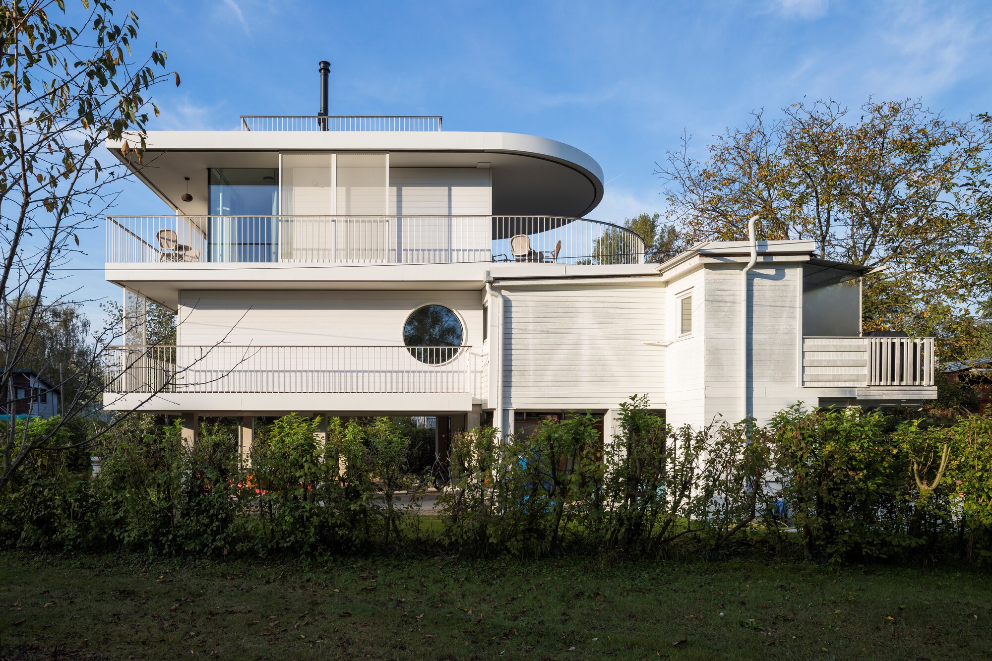 大きな窓、オーバーハング、多くのオープンゾーンは静的に非常に困難でした。丸い窓がヨットを思わせます。また、のぞき穴付きの特注の引き戸は船のテーマを反映しています。地元の大工が作った造り付け家具が、狭いスペースを最大限に活用します。油を塗ったスチール製のプレートが階段と暖炉を保護します。その結果は、集落のアンサンブルによく適合します。近所の人たちもこの追加を称賛し、通常は批判を差し控えません。