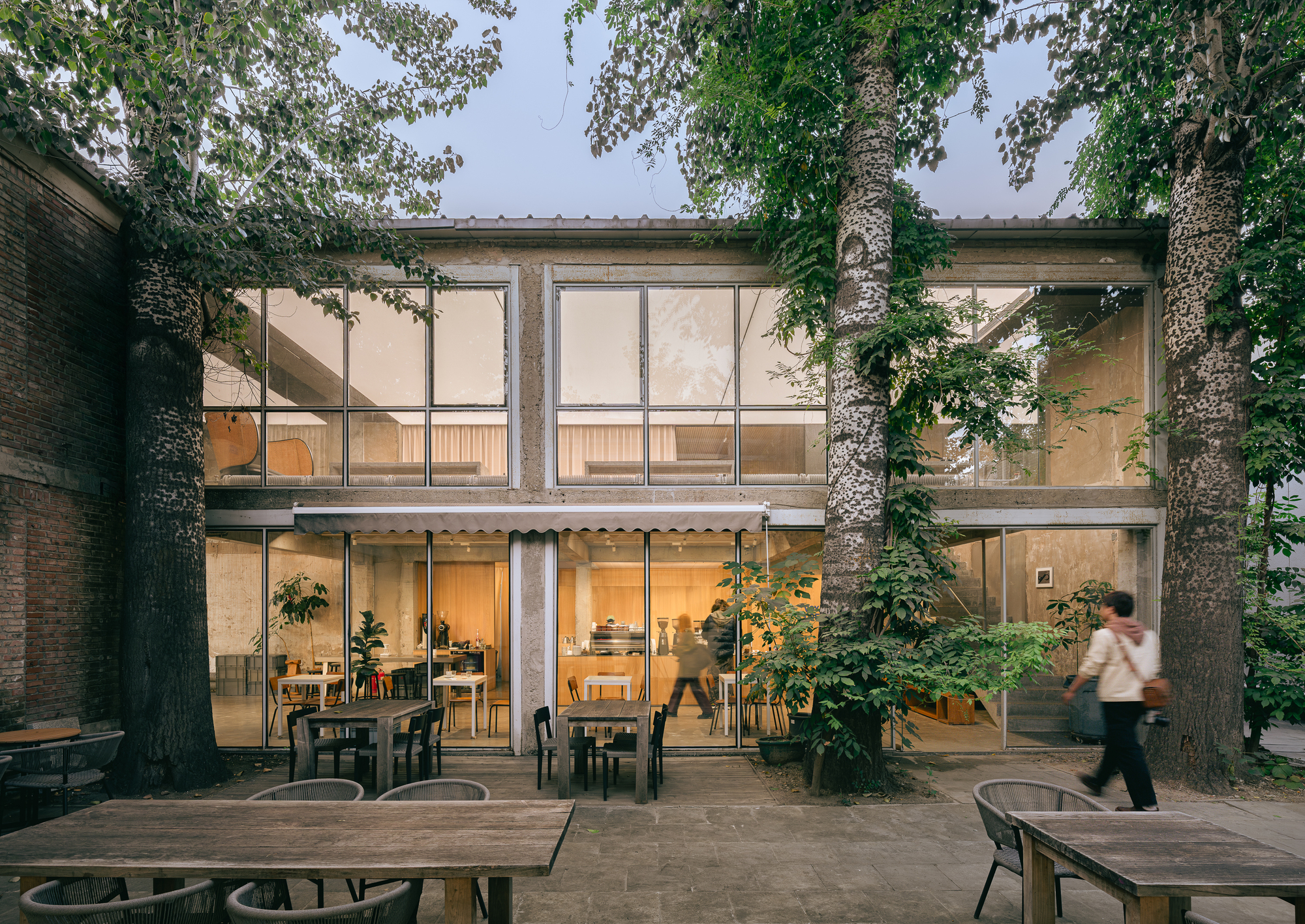 中庭に面した北側のファサードは、2016 年に北棟のコーヒースペースの改修方法を引き継ぎ、元の赤レンガのファサードを鉄骨構造と大きなガラスに置き換えました。このとき、元々屋外の中庭を囲んでいた南北の壁は開放的かつ透明となり、屋内と屋外の関係が曖昧になり、視覚的には囲まれた中庭空間の境界が敷地全体の最も外側の壁に押し戻されることになる。中庭の大きな木々は、むしろ「大空間」全体の柱のようなものであり、空間の要素となっている。