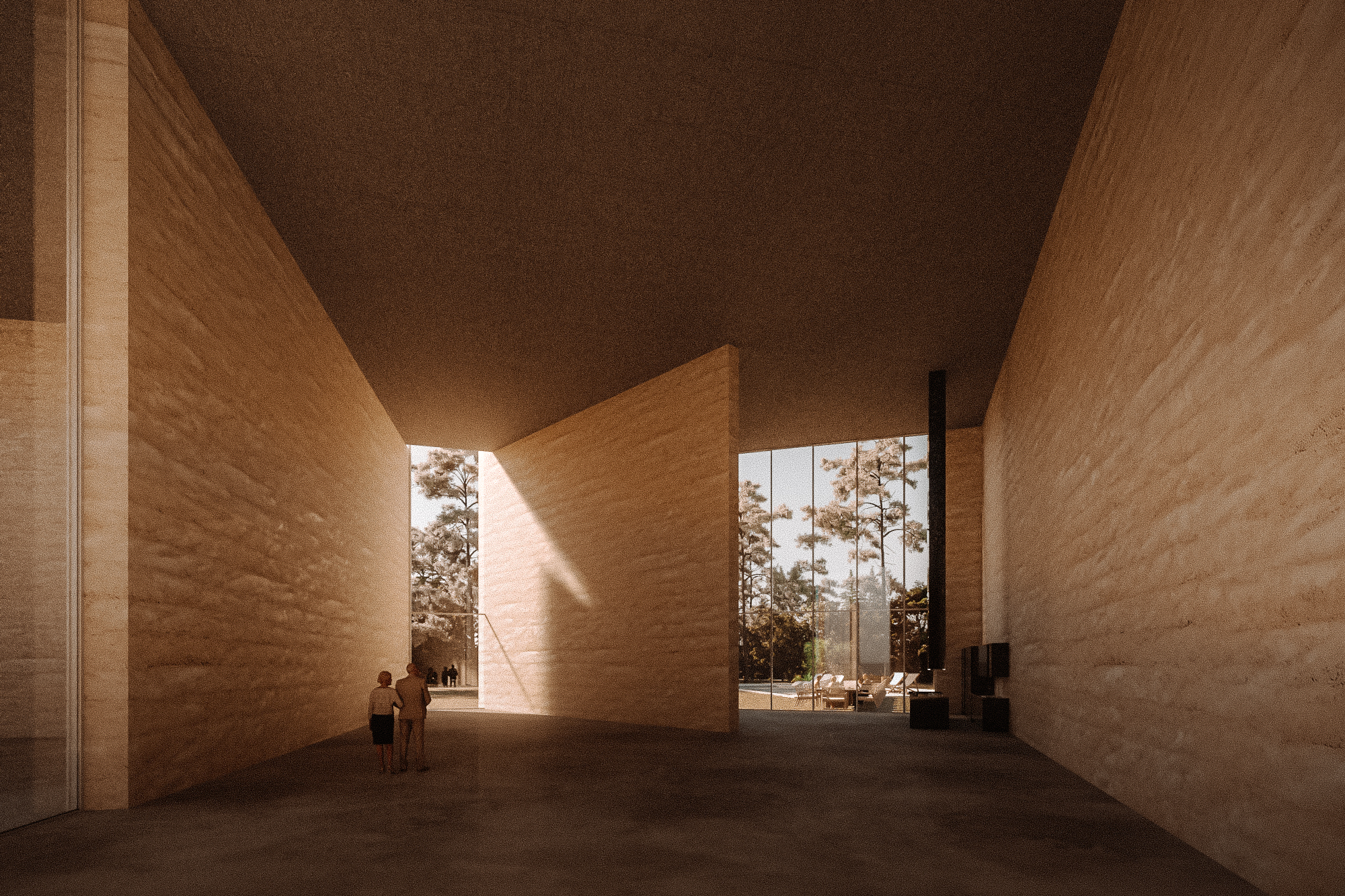 このホスピスのデザインは、自然と建築の調和に重点を置き、周囲の風景からインスピレーションを得ています。安定性とバランスを象徴する中央の四角い中庭は、内部環境と外部環境が交わる出会いの場所として機能します。あらゆる角度から景観を楽しめるように配置された建物のレイアウトは、それぞれが異なる機能を備えた 5 つのブロックで構成されています。穴の開いた角屋根と吹き抜けが屋内と屋外をシームレスに結び、静けさを高めます。放棄された採石場に位置するこのプロジェクトは、その土地の歴史的重要性を尊重しながら、独特の地形と穏やかな風景が癒しと幸福を促進する癒しの空間を作り出すために土地を再利用します。
