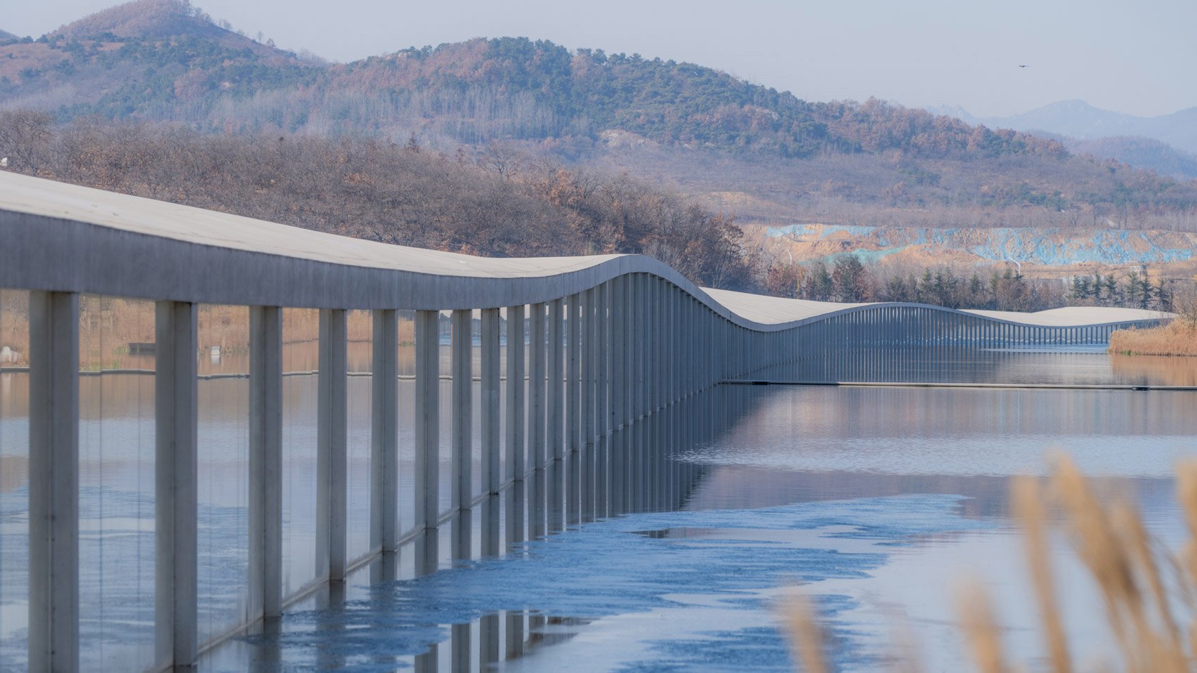 「イエスと同じように、石上純也の在水美術館では訪問者が水の上を歩くことができます。この場合は中国山東省の人造湖です。
