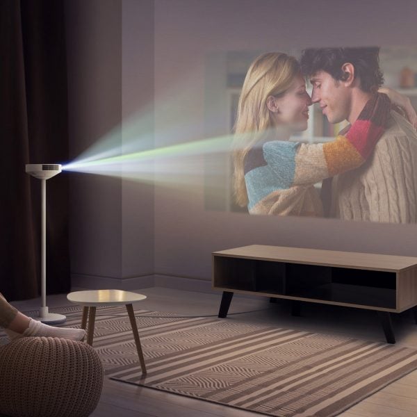PF600U のデザインはフロア ランプを参考にしており、円形のベースと直立したポールが 110 度傾斜するヘッドを支え、近くの壁に画像を投影するための自動スクリーン調整機能を備えています。