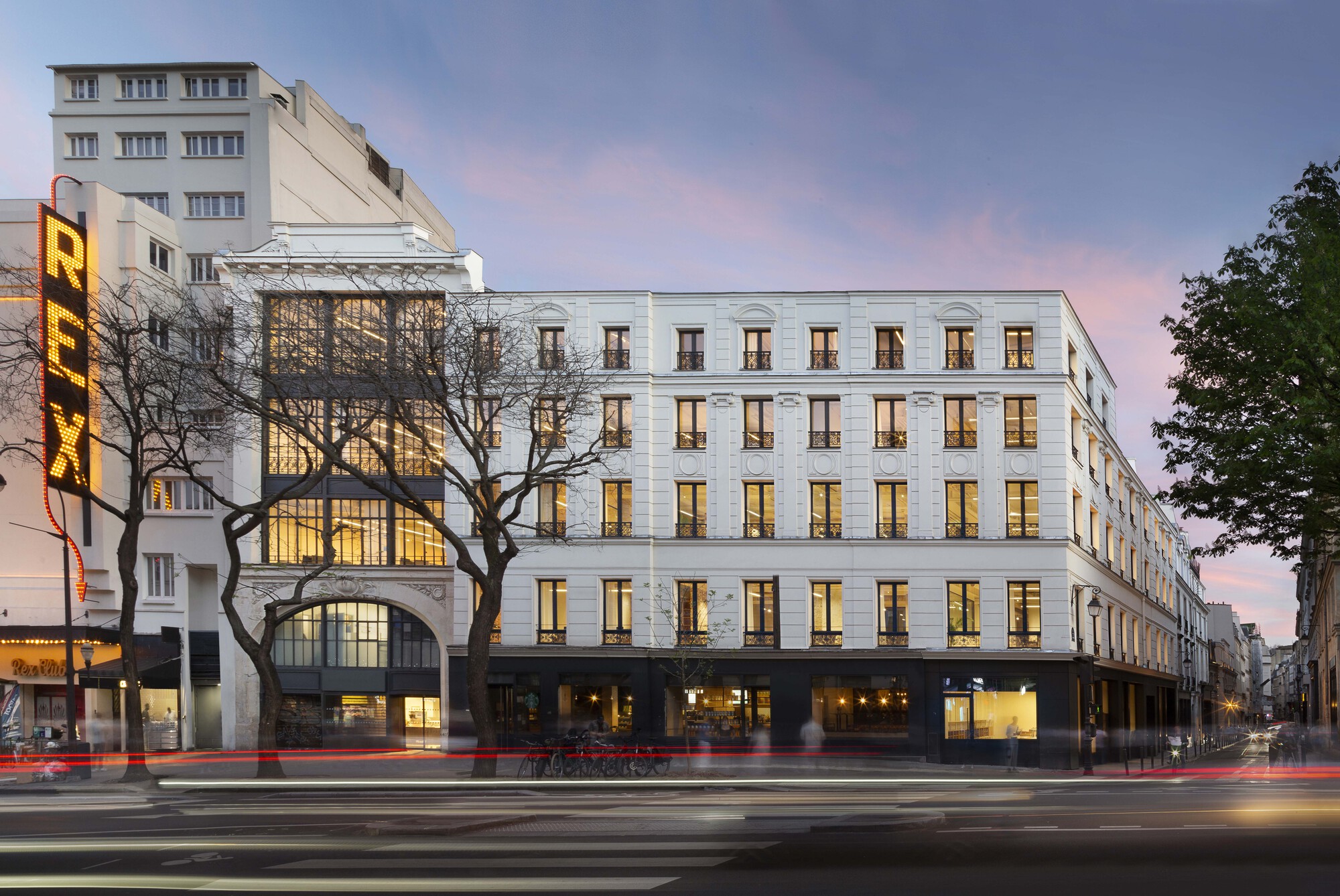 まず、通りに面したファサードは、大通りの特徴を尊重して元の外観に復元されました。建物の商業基盤は、新しいダークグレーの花崗岩の外装で強化されました。