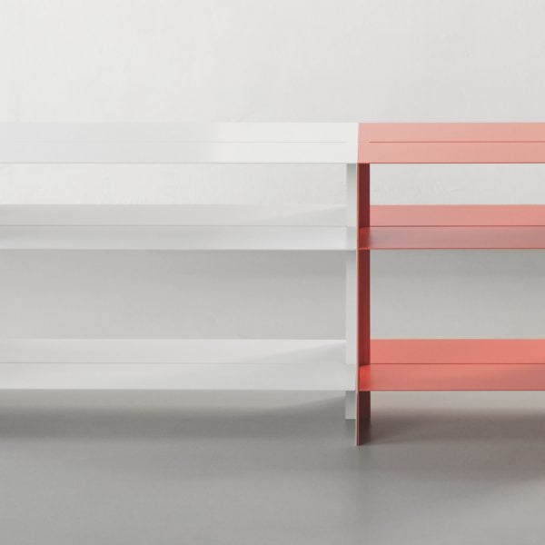 コレクションには、厚さわずか1.6ミリメートルの軟鋼板を直角に曲げて連結することで、スリムな外観ながら堅牢で安定した構造を形成した収納ユニットとウォールシェルフが含まれます。